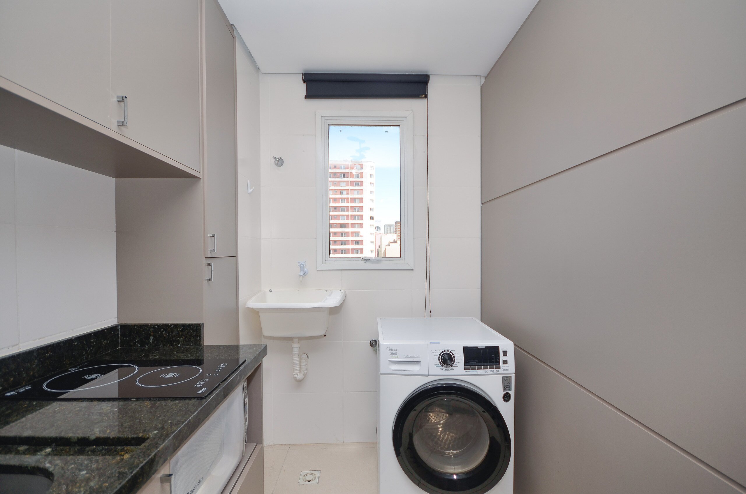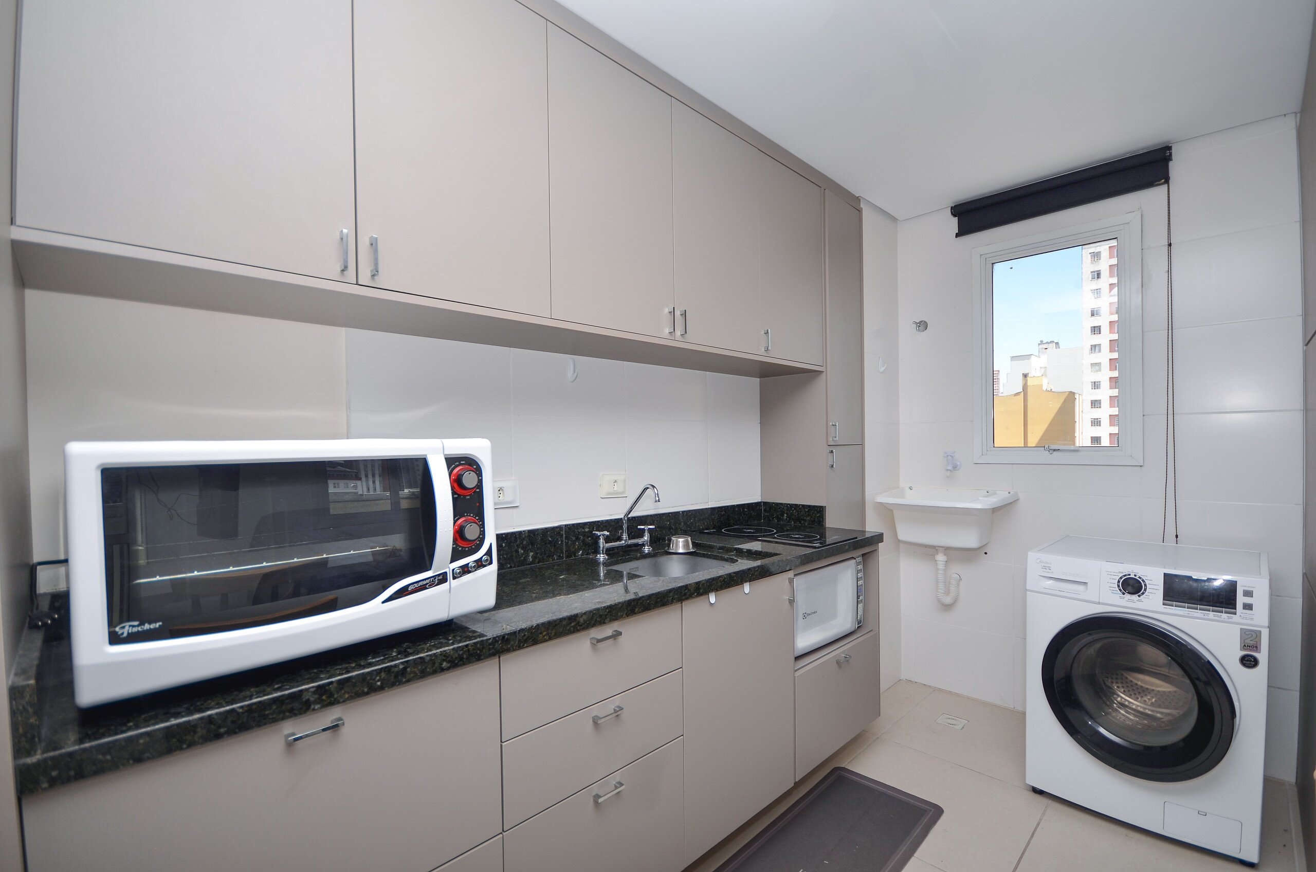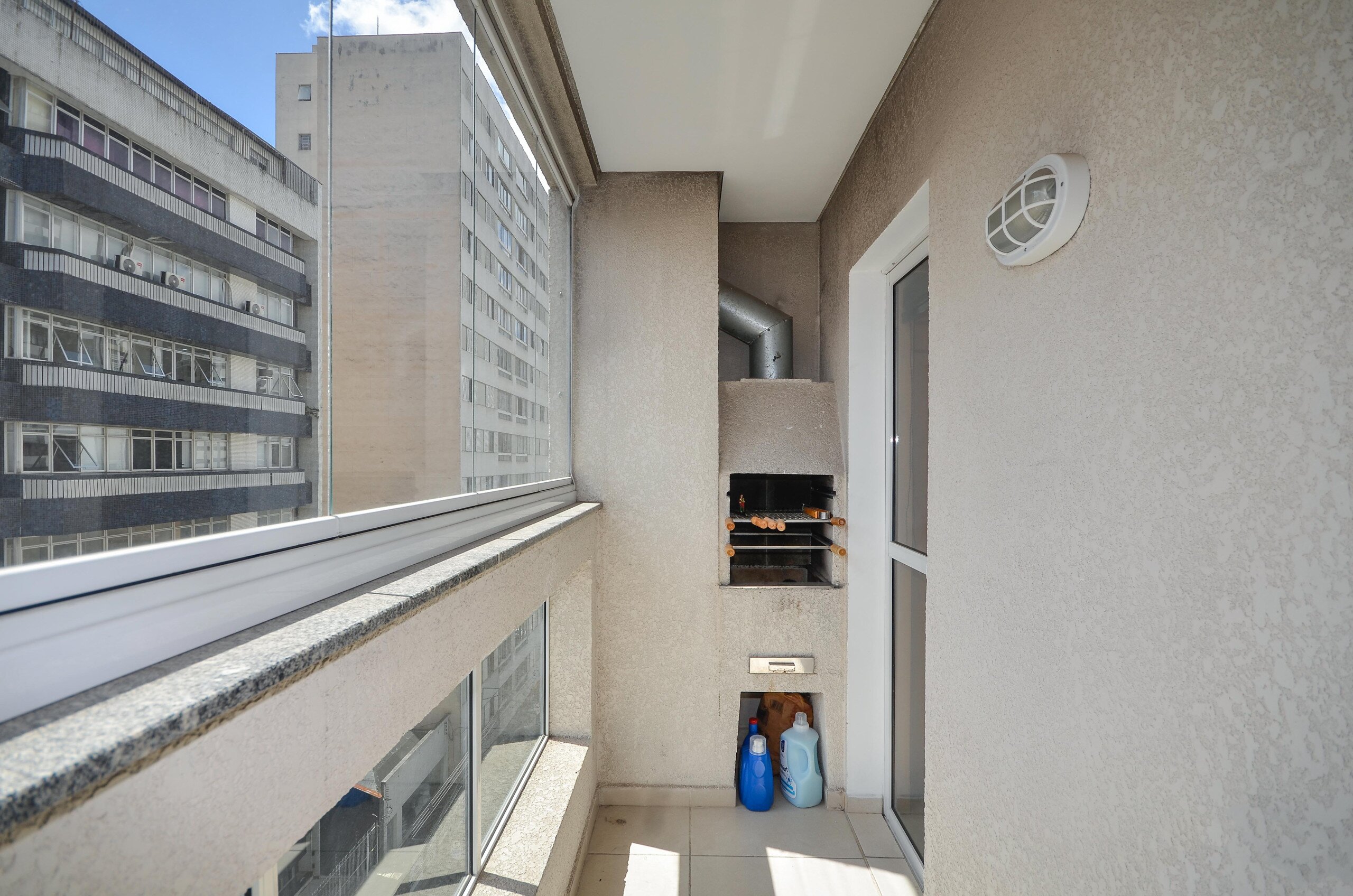 Semi mobiliado, sacada com churrasqueira a carvão, área de serviço com tanque.