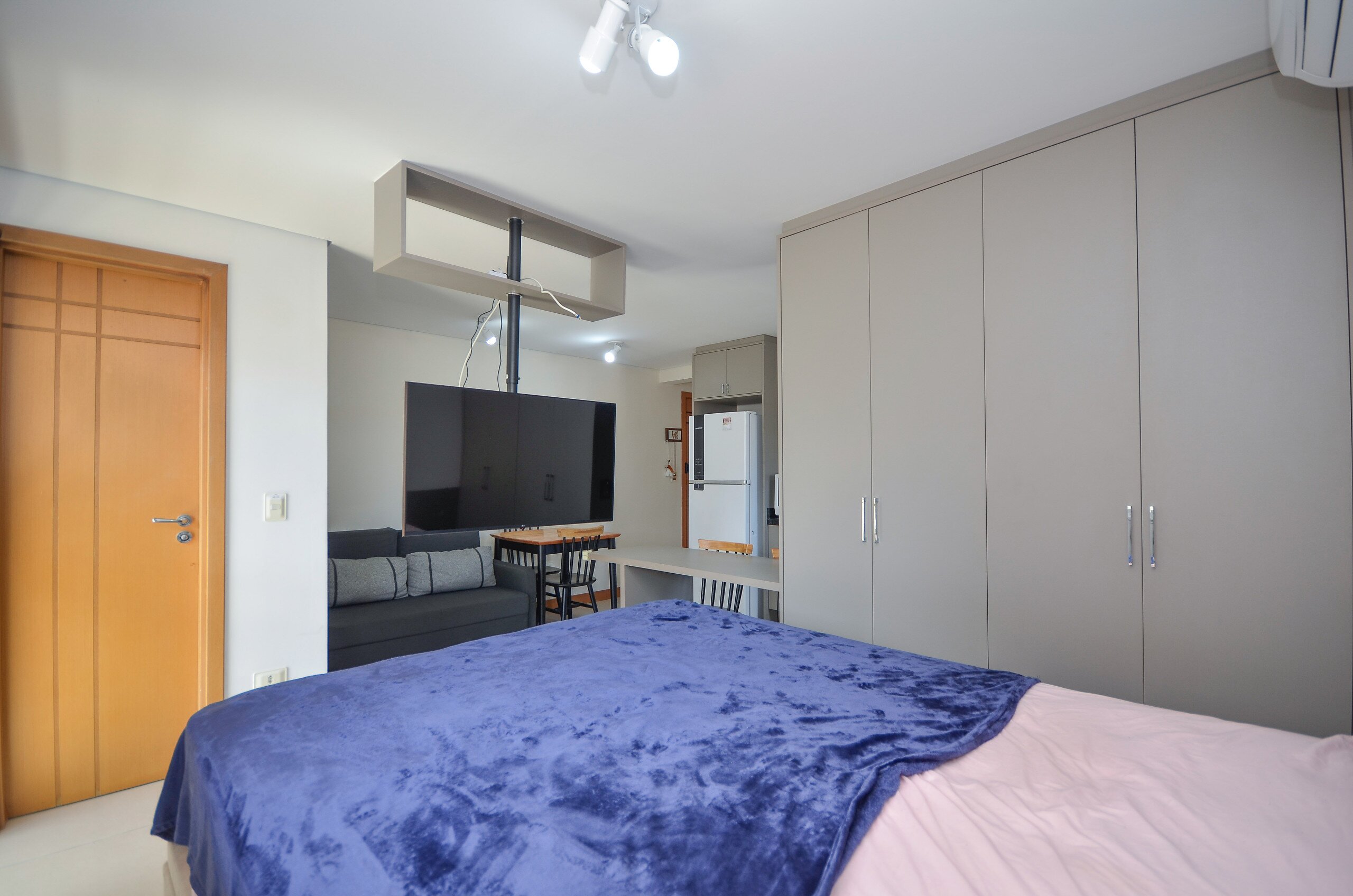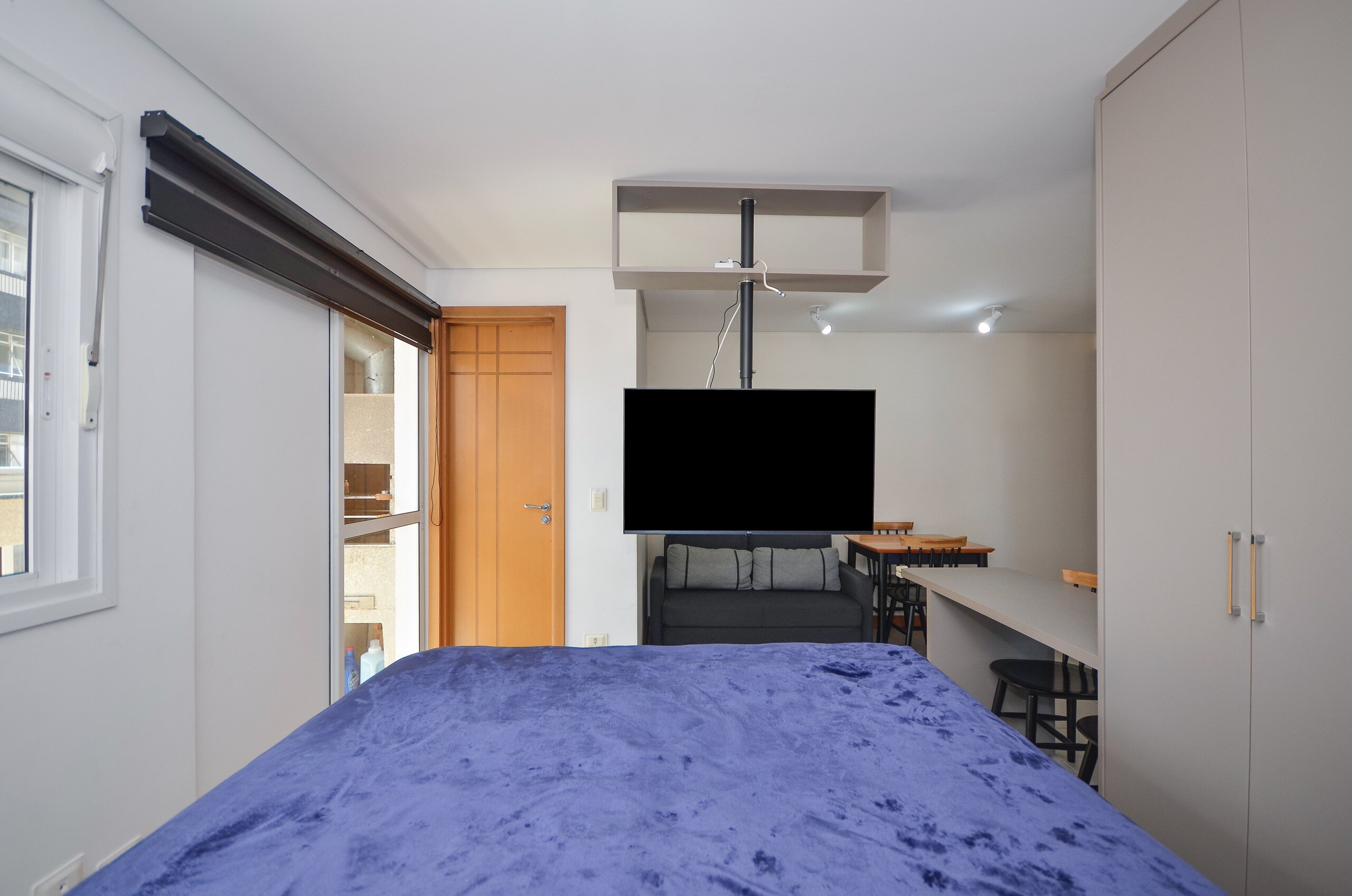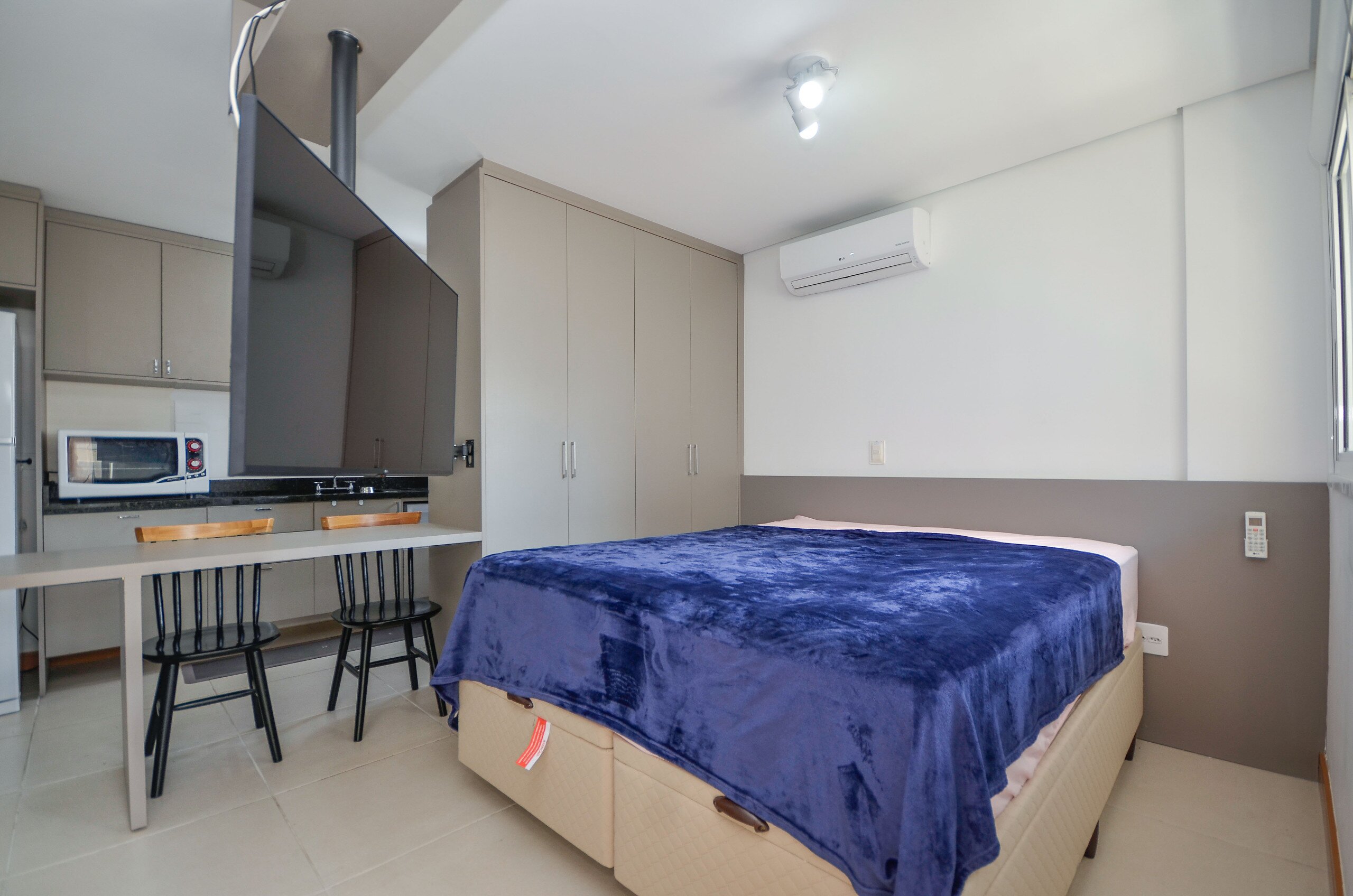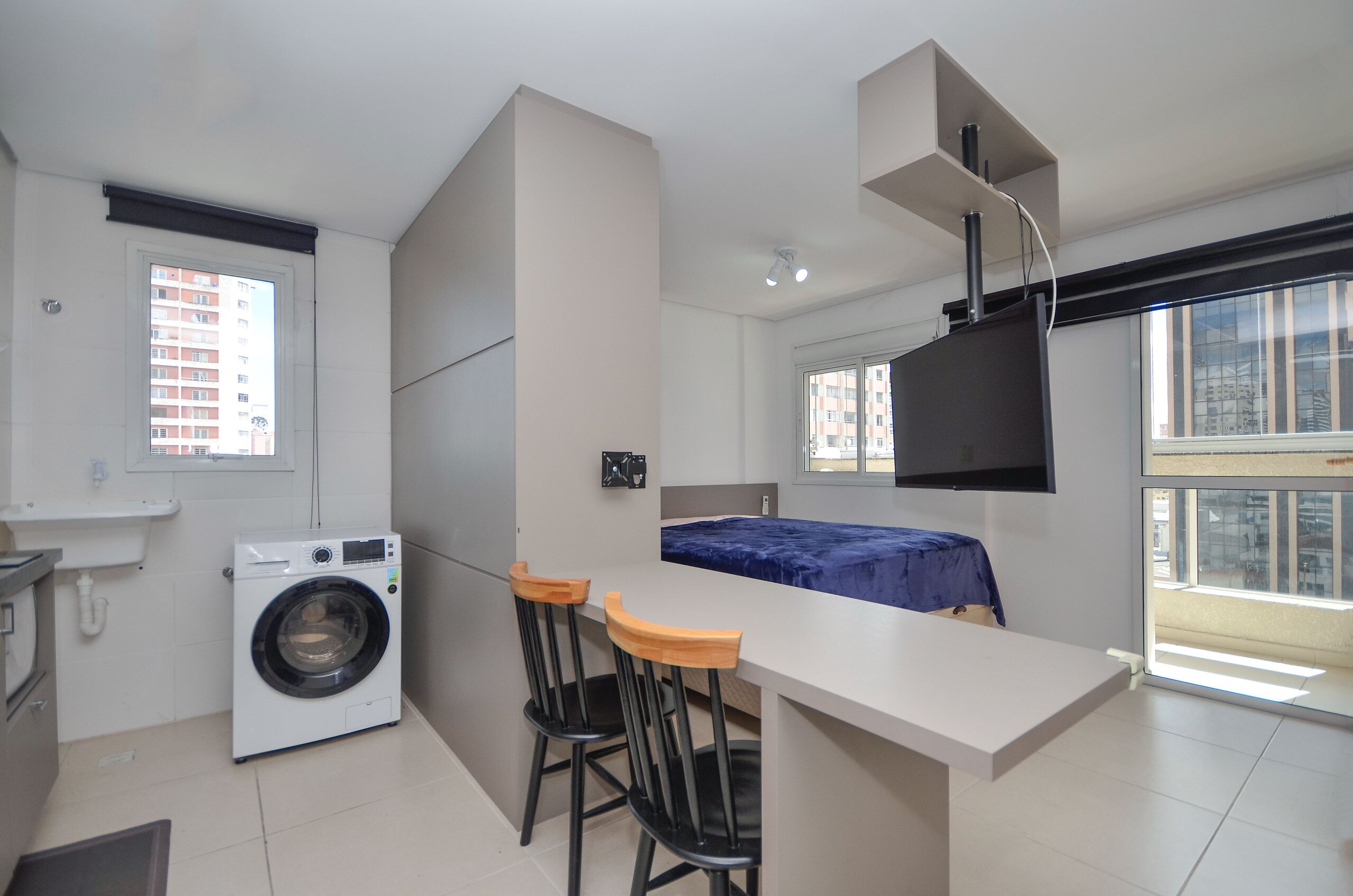 O Studio possui móveis planejados para um maior aproveitamento de espaço, janela com veneziana, box blindex, ventilação natural cruzada.